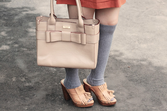 SHEINSIDE.COM red notch lapel coat/ F21 sheer shirt/ g.u. japan tangerine circular skirt/ honeys japan high knee socks/ kate spade villabella quinn tote bag/ retail therapy tassels wedge